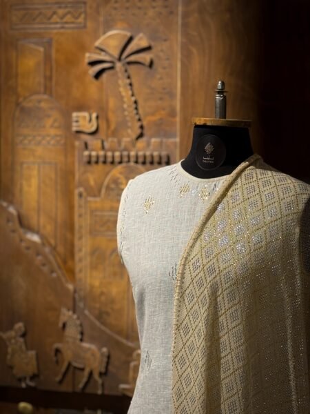 “El helm” (the dream) dress was one of the reasons that made us create Tallyna. As tally lovers, we were wondering: Why can’t we find a beautiful tally dress on the market, combining neat hand embroidery, fashionable design, premium quality and finishing?! So we decided to pursue our dream and make it! The dress is a real eye catcher, made of black cotton tulle, heavily hand embroidered with silver tally threads, featuring geometrical patterns and showcasing the mastery of our artisan ladies who spend 4- 6 weeks of hand embroidery to achieve this masterpiece.
