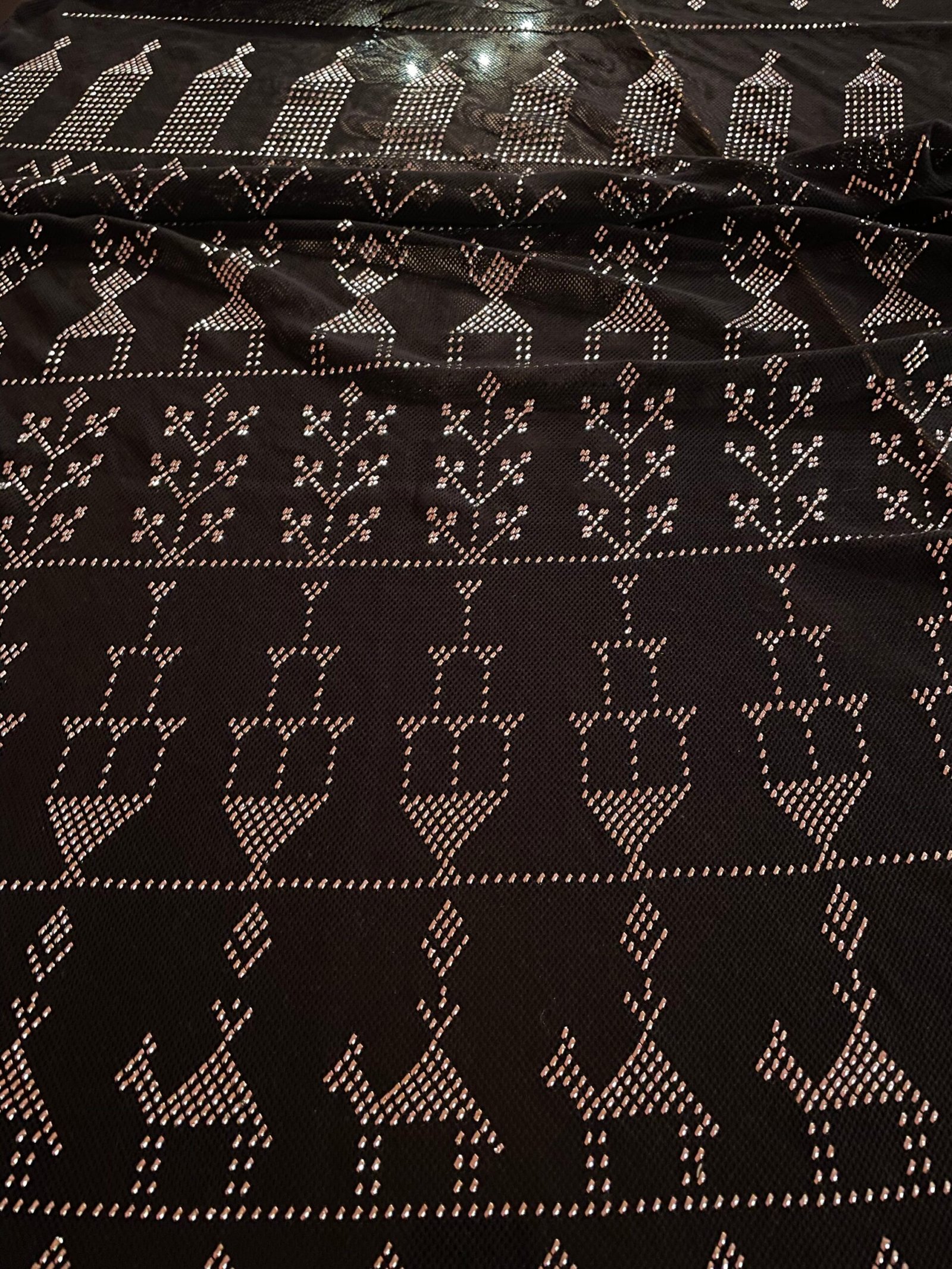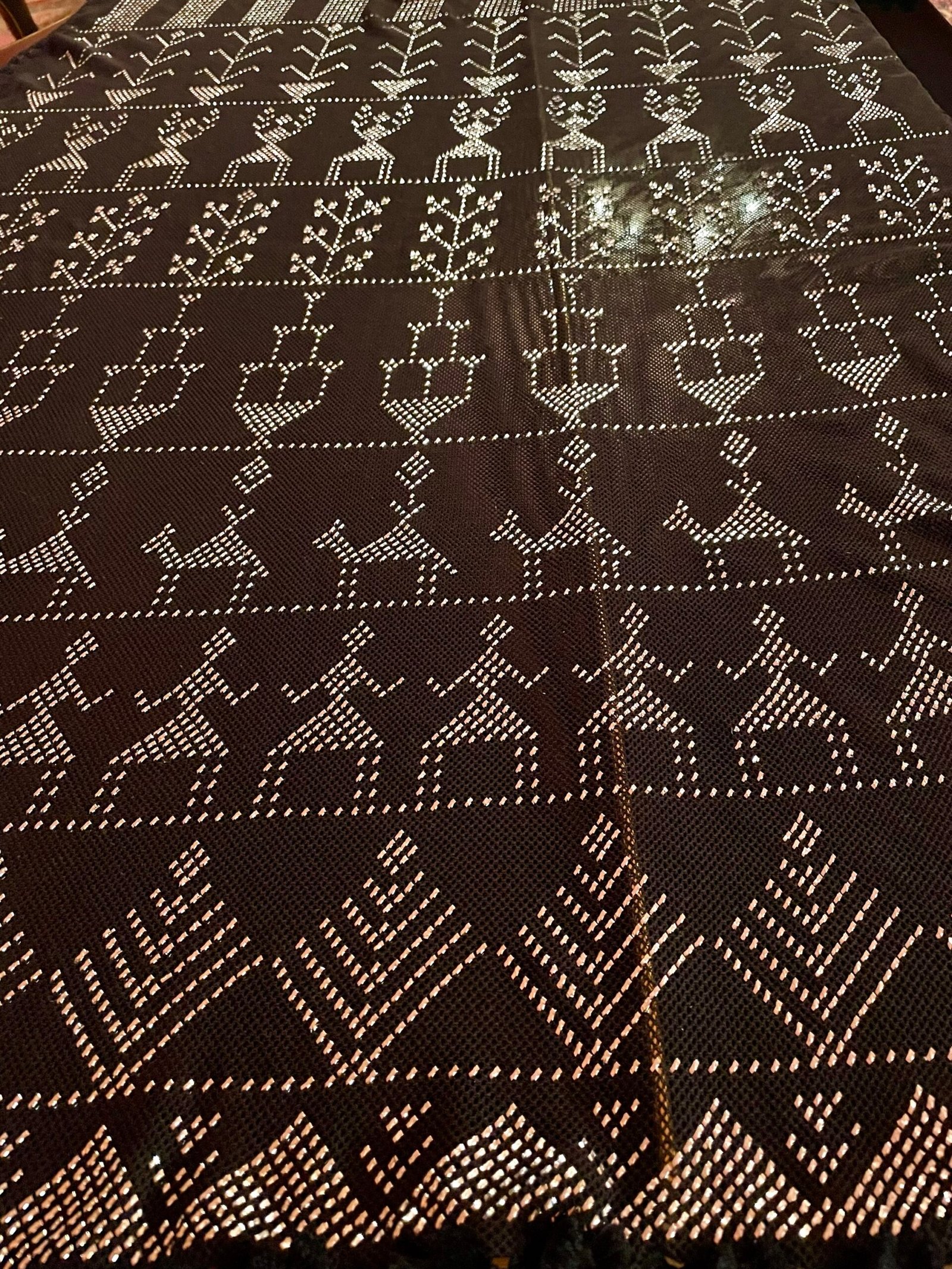 Farah shawl is an elegantly hand embroidered black shawl with silver tally threads. Its motifs represent the bride’s environment. The shawl is a celebration of life, joy and traditional heritage. The hand knotted tassels at its end add to its cheerful design.