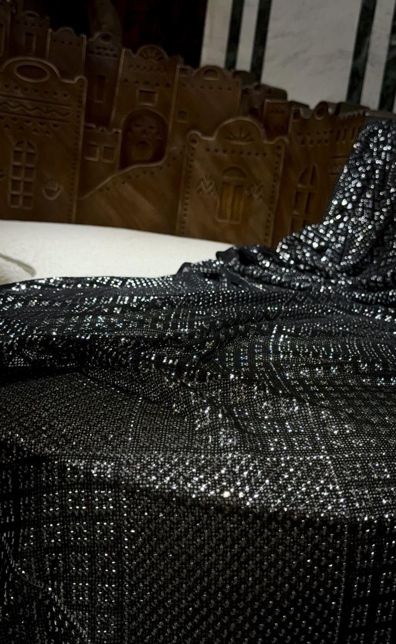This beautiful shawl holds the mastery of geometrical patterns, stitched with talent and patience. The shawl is made of black cotton tulle, hand embroidered with silver tally threads. The hand embroidery takes 5 weeks and must be done by one of Tallyna’s senior artisans.