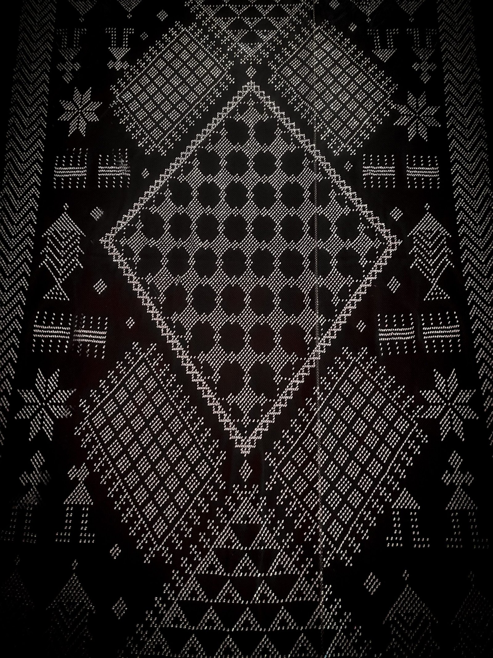 The shawl is made of black cotton tulle, neatly hand embroidered with silver tally threads, featuring traditional motifs, combined with geometric patterns. A unique masterpiece!