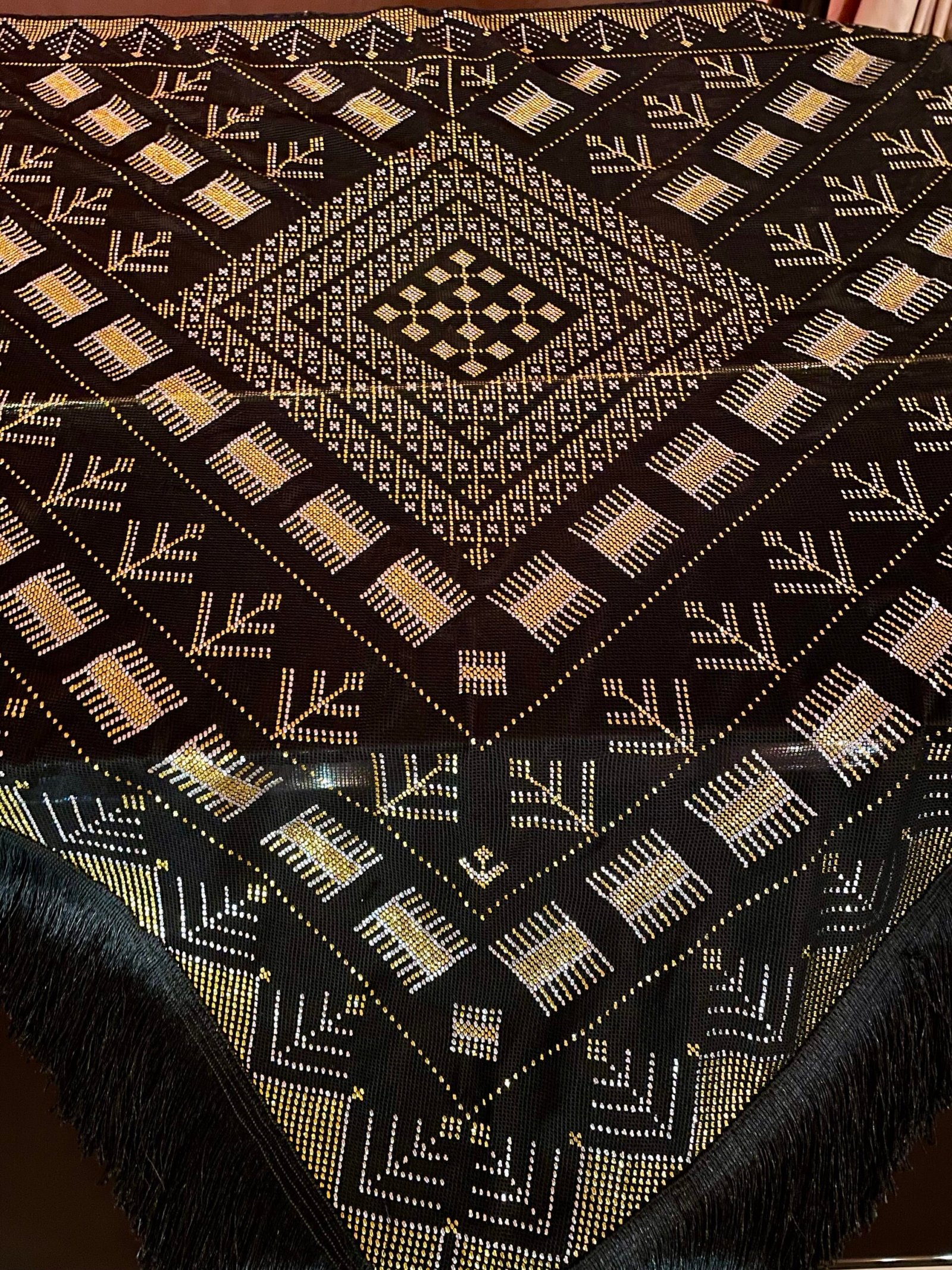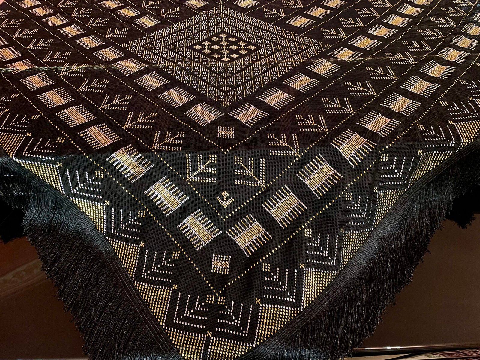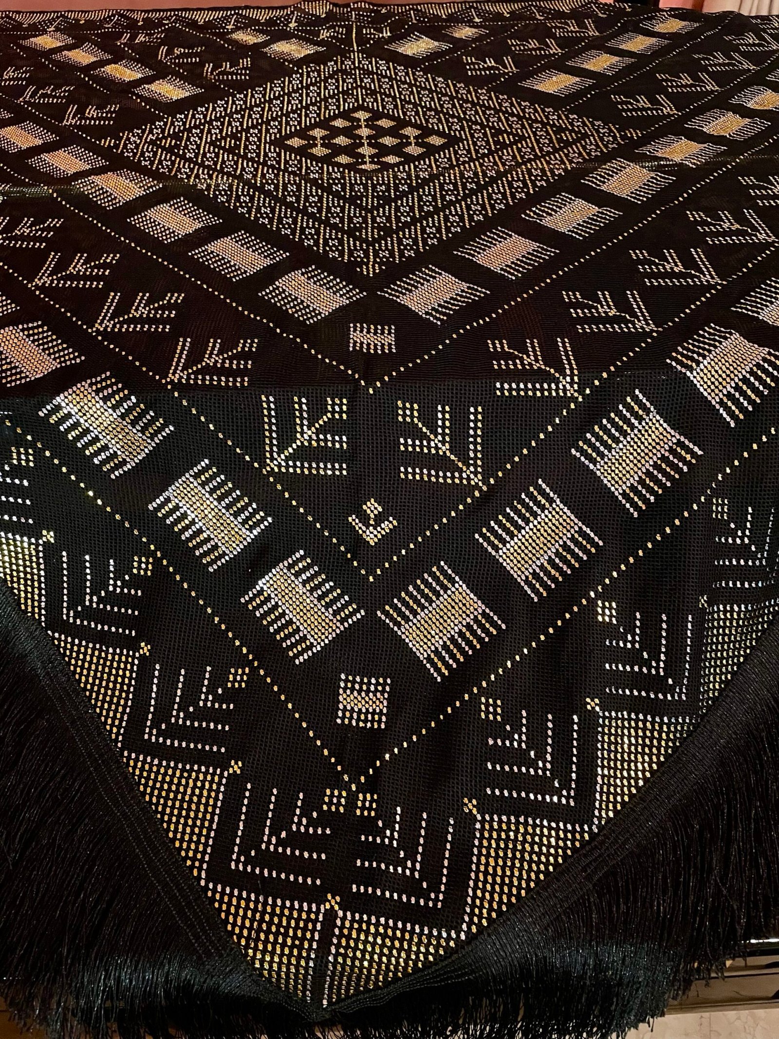 This triangular version of Samiha shawl is a beautiful piece of art with its sophisticated centerpiece and the fringes at its ends. An eye catcher that will make you turn heads wherever you go. The black shawl is hand embroidered with gold and silver tally threads; it takes 6 to 8 weeks of neat hand embroidery